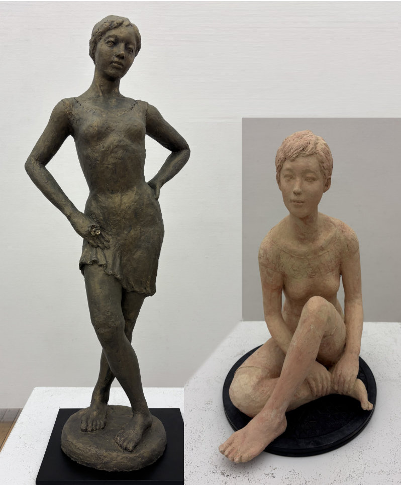 芹田静枝 「春を呼ぶ人 春を待つ人 105×40×25 85×25×25」 2022年自由美術展
