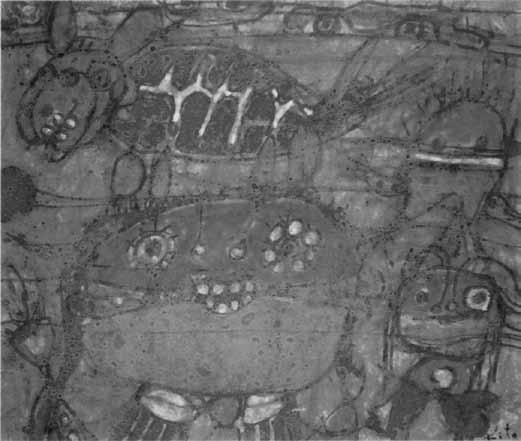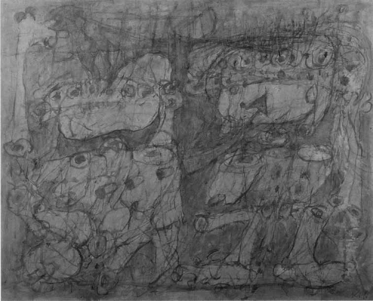 お二人が収蔵庫の奥から苦労して取り出して見せてくれたのが掲載写真の作品である。恵さんがタオルでふくと、黒い画面がはっきりと現われた。手製のキャンバスと木枠による60 号P型。裏に出品票の貼付はないが、チョークでの4 桁の数字と○印が認められるので自由美術に出品をはじめて間もない頃の作品であろう。古い出品目録によると大成さんの初出品は1952 年16 回展の「椅子」で、17 回展「作品」18 回展「立つ人」19 回展「出来ごと」と続いている。この作品は19 回展出品の「出来ごと」ではないかと思われる。当時の作者の置かれた状況の痛みが具体的・切実に笑いさえも交えて表現されている。最近このような作品を見ることはなくなってしまったとの感慨にひたり、しばらくの間見入ってしまった。その後「船」を経て「崖の根」「這う根」「根塊」「落ちる木」「落ちる根」「土塊」「風景」など従来あまり絵にされてこなかったものを主題とした連作へと続いている。