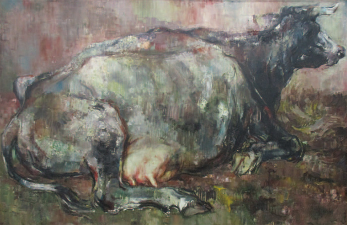 昨年開かれた第70 回日本アンデパンダン展の企画展示「春を待ち、闘った、激動の60 年代美術」に出品された大成さんの「乳房」は、膝を折って憩う雌牛の姿を画面一ぱいに描き、その強く的確なリアリズムの表現は会場の中で一きわ異彩を放っていた。恵さんによるとこのような描き方の時代はとても短い一時期だったとのことである。