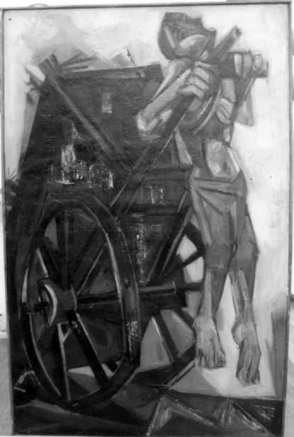 初出品の頃 大成瓢吉「当時食う為の同じ仕事をやっている仲間から自由美術のこと等も知り、又他の人にも奨められ公募展には初めて出した。1952 年16 回自由展で初入選、もう25歳、二児の父親となっていた。身近かな人達の絵を識って見ると、それらの作品は自分達の立っている地盤からの“仕事”であることを感じた。私は同世代のように仲間で飲み、語り、ひたすら勉強を続けた青春ではなかった。生活は一刻も待ってくれず歯ぎしりの連続であった。遅ればせではあったが自分の経て来たこの生活を土台として、ギリギリの中での手製のキャンバスに描きえのぐが厚くなると裏からお湯をかけて剝しそれを繰り返しながら、黙々とやる他はなかったのである。」(1969 年2 月アトリエ№ 504)