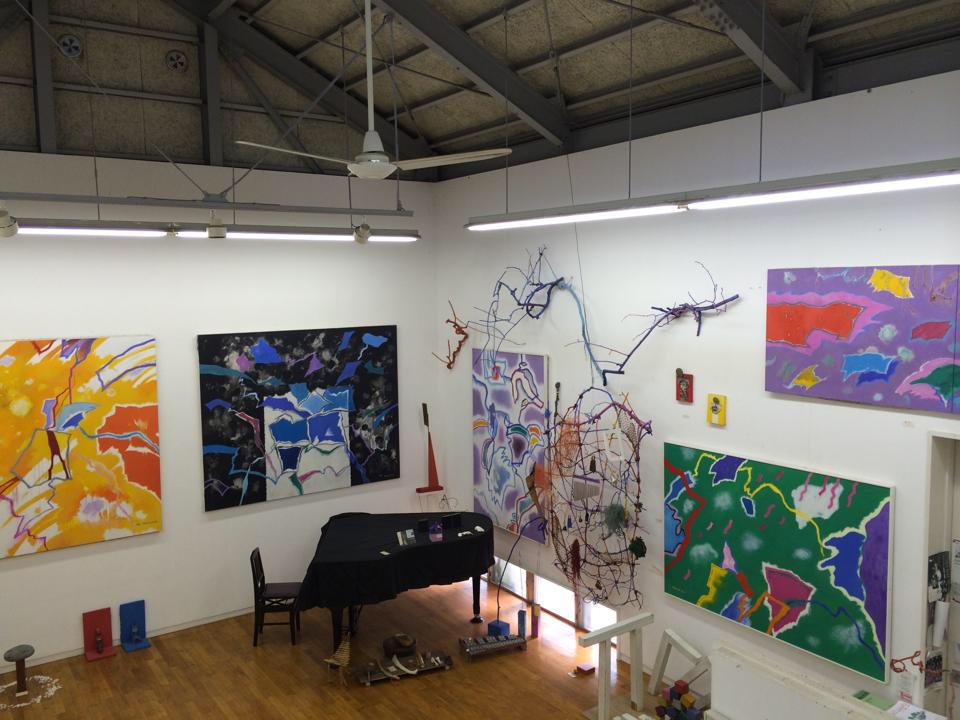 4 月27 日午前9 時半、東京駅ホームで西村さんと待合わせ、東海道線で湯河原駅へ。途中の車窓から間近に見える海が美しい。駅からバスに乗り終点鍛冶屋で下車、静かな畑の道を5分程歩くと右側に見えてくる大きな倉庫のような建物が空中散歩館である。入口の扉を開くと高い天井、白い壁の開放的で広い空間が広がる。右側の壁にはオレンジ色が美しい200 号の「讃歌」(1992)、その隣に黒と青の「旅立つ青」150 号(1995)。正面には節子夫人の120 号~60 号の淡いグレーの作品が数点。大小の作品のかかる壁面の前の床には、次女の恵さんの立体作品などが直に置かれている。部屋の角にはグランドピアノ。館の左奥は作品の収蔵庫になっており、その1 階・2 階には大きな作品がぎっしりと詰っている。
